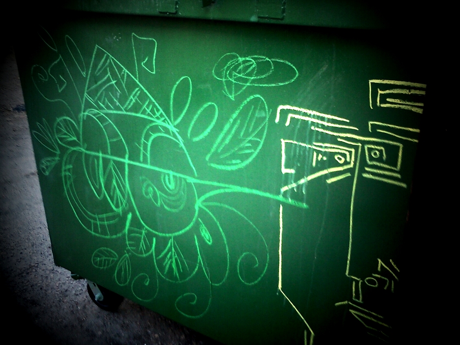 Example 5: The vast majority of markings that one spots on a dumpster tend to fall into the Tagging category. Every once in a while, that is not the case. I happened to see this, in my alley, because I randomly turned back to look behind me at the right time, in the right place. Otherwise, I would have missed it. From a technical perspective, it’s not *really* anything to swoon over. But it’s organic and something that I was not expecting to see, so it made me happy.