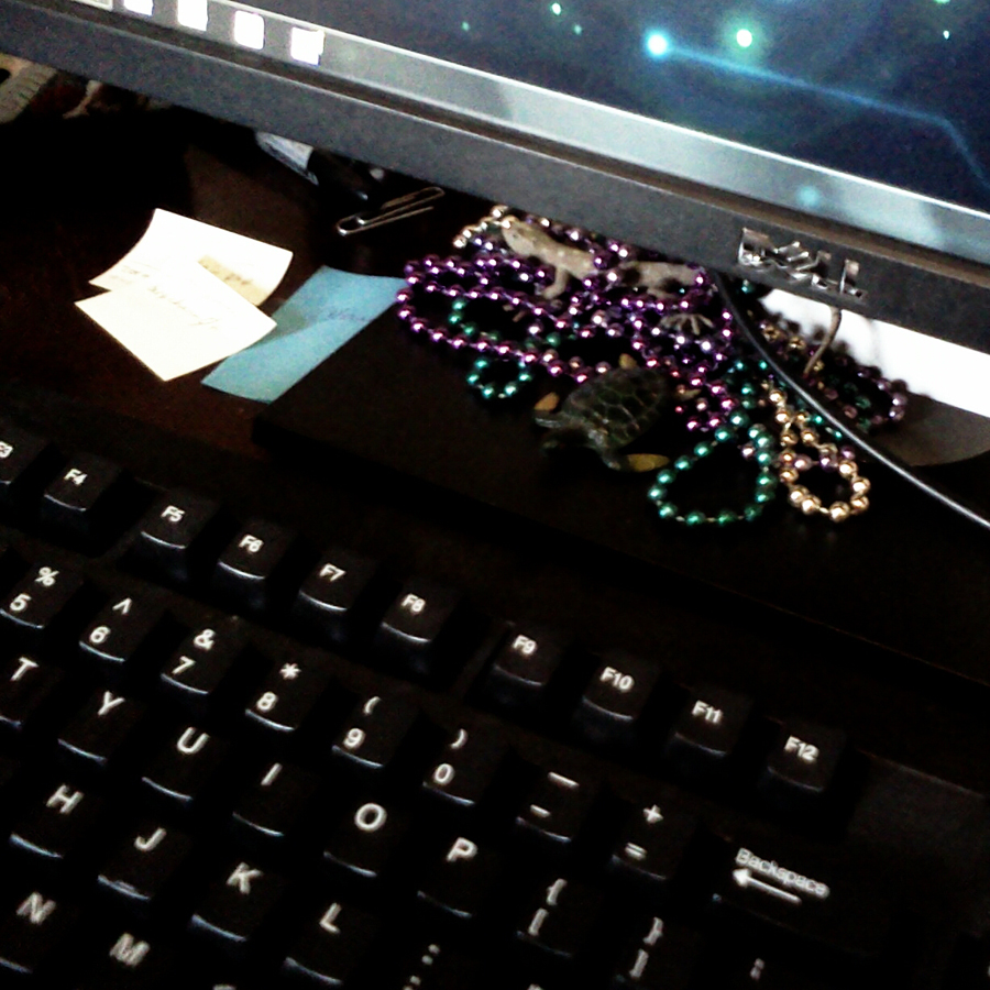 It’s interesting, when one has an office, the THINGS that just accumulate in there. I think I’ve had that lizard on my desk since…2005? The beads are only a year old or so – some from my New Orleans-themed birthday cake from a coworker year before last, and some from the King Cake I made and brought to work for Mardi Gras last year.