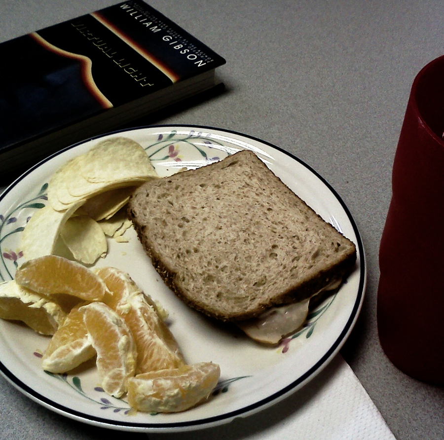 And then, there’s lunchtime. I always pull out the food of the day and settle at the table with my book of the day, into which I promptly shove my nose and proceed to, typically, drown out everyone around me for an hour. Or I chat, when I’m feeling chatty. This past week, I accidentally managed to have some sort of Tour of Asia with my meals…this happened because I was running late Monday, and did not have time to pack a lunch. So I ordered chinese food instead. (I’m not too lazy to go home at lunch…but it seriously freaks the dog out.) In order to hit the delivery minimum, I wound up getting what I thought was enough to feed myself for that day, and the next. When it got there, I found that they are ridiculously generous with their portions. I had enough to last FOUR DAYS. And that evening, J wanted Thai Basil. *dies* After pad thai on Monday, vietnamese beef that night, fried rice on Tuesday, and MORE pad thai on Wednesday, I was more than done. Luckily, I had a lunch date out with my parents on Thursday. Friday, I went down the scary stairs, tossed whatever was left, and happily had my plain ol’ lunch. But yeah, talk about oversaturation.