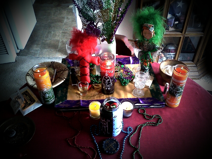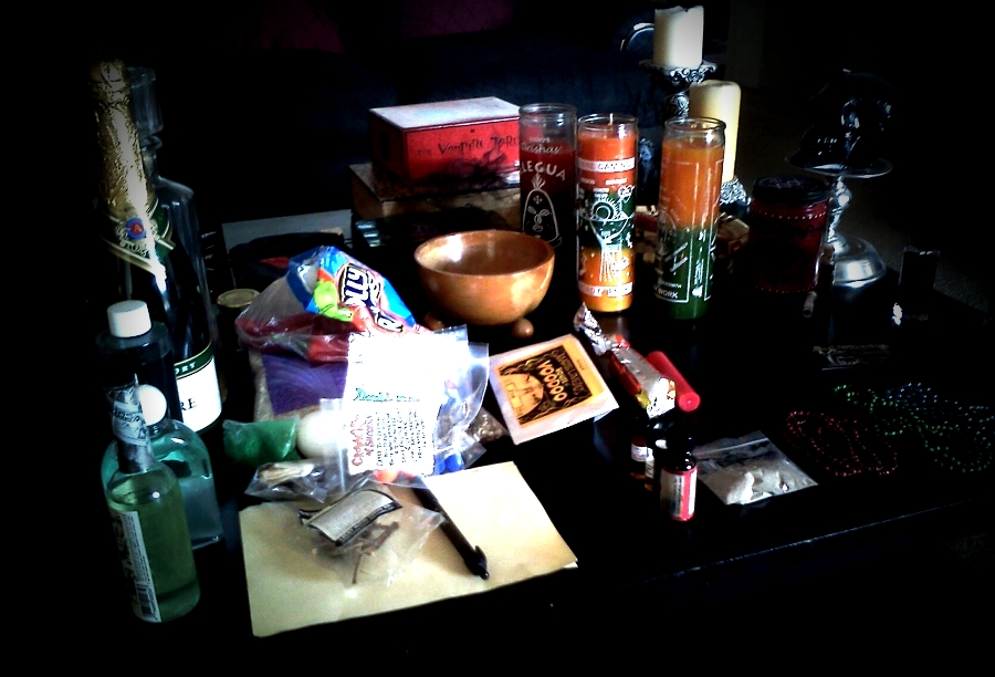 View from straight-on.  From left: Job incense from Marie Laveau’s – as cheesy as it sounds, it worked for us once before; job candle, with offering basket behind it, Papa Legba doll, and candle; Oshun (I brought her in because she’s helped me before and given me rather good advice); Damballah’s egg; Road Opener candle; Jar and beads in front waiting to be sealed.