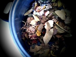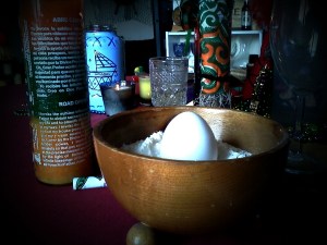 Once it had simmered long enough, I put it in a glass bowl and took it outside to the balcony to let it cool.  It’s not fun splashing literally-boiling water on oneself, so cooling was essential.  The Road Opening voodoo bath took place out there, and involved both J and I splashing the water from the bowl onto our heads, backs, arms, and legs.  It was chilly out, so needless to say this part of the procedure was rather invigorating, and definitely woke us up.
