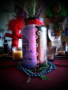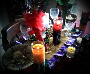 When we were done, we set the jar’s lid aside to wait for Agwe’s champagne to flatten a little, lest the whole thing explode!  And decided to set up an entire altar around the thing.  We normally keep works like this on my altar in our bedroom, but for this…well, we want it to be in front of us and out where we do most of our living, all the time, constantly.  That way we can continue to feed it, to add offerings, to perpetuate its energy.  All of this means that our dining room table is one big altar right now.  😉