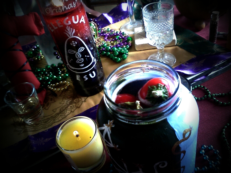 And then it was time to get to Work.  I didn’t photodocument this part, because it is an understatement to say that my focus was very much on the task at hand.  We filled the jar up with all sorts of things – herbs and powders geared toward open roads, success, luck; some gris gris made by Mimi at Esoterica that we picked up last time we were in New Orleans in 2010; some of the loa-specific offerings that were small enough to fit; our packets with our needs written out; I could go on and on.  There’s a lot of stuff in that jar.