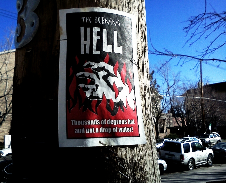 Meanwhile, our flier-stapling religious guy was at it again. I have been seeing these things all over the neighborhood for YEARS. The design never varies, it is always the one below or another one with a blue theme, the captivating statement of which I cannot recall. At any rate, I used to see them and pull them down. Not particularly out of spite but because I had some idea in my head for some crazy piece of collage art using these things that never panned out. I remember a time last year when, once again, I was walkin’ the dawg and finally actually *saw* the person in question. It felt like witnessing some sort of rare species of critter in its natural habitat, Jane Goodall style. Here came this casually dressed elderly gentlman up the sidewalk…I continued to tend to the sniffin’ hound and did not pay him much attention. Until I saw him walk up to that pole (from which I had stripped the flier the day before), pull a piece of paper out of one pocket and a stapler out of the other, and begin his Work. His perserverance was impressive. Pull the flier down, he just puts one back up. Pull it down, put it back up. Rinse, repeat. So, last Friday, the familiarity of this Thing which has been stapled oh so many times to this same pole, made me smile. And I finally shot it.