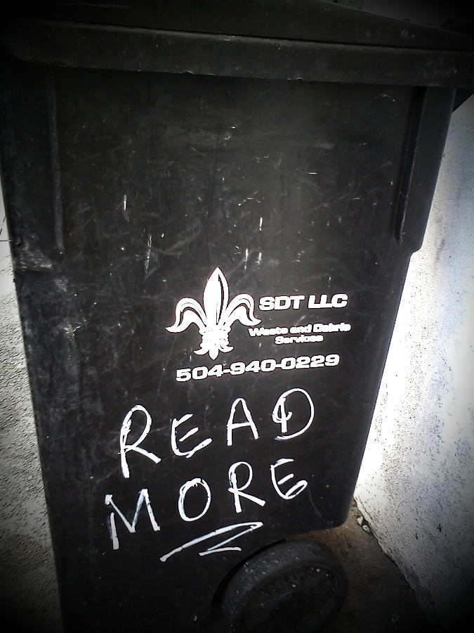 On a completely unrelated note, J and I were in the Quarter the other day. Shocking, I know. And we were taking a fairly-usual path from our sneaky Marigny parking lot, up Decatur St., and over onto Ursuline, when lo did I espy another push toward literacy. This time, on a trash can at roughly Ursuline and Bourbon. Ish. I’m developing a fascination with these “READ DAMMIT” sorta sightings, as they are showing themselves to be a rather common theme.