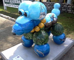 Yay blue dog! I know that it is a running image all over town, and that it is done by an artist called George Rodrigue (who also has a gallery in the FQ with blue dogs all over) – I am still uncertain, though, as to how or why it became SUCH a New Orleans icon. Something else to look into! 🙂