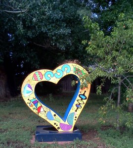 Staring either despondently or zonily out the car window one day a couple of weeks ago, no doubt pining prolifically over my o’ so far away Bead Dogs, I began to notice something as we ambled about town. Hey, there’s a heart sculpture, that’s pretty cool lookin’. Oh, hey, there’s ANOTHER one! And it’s different! My mind, of course, immediately engaged in this mystery and, when the folks said, “Oh yeah, they’re all over town!” I instantly vowed to Collect Them. Why not? I’m here, they’re here, have them I must!