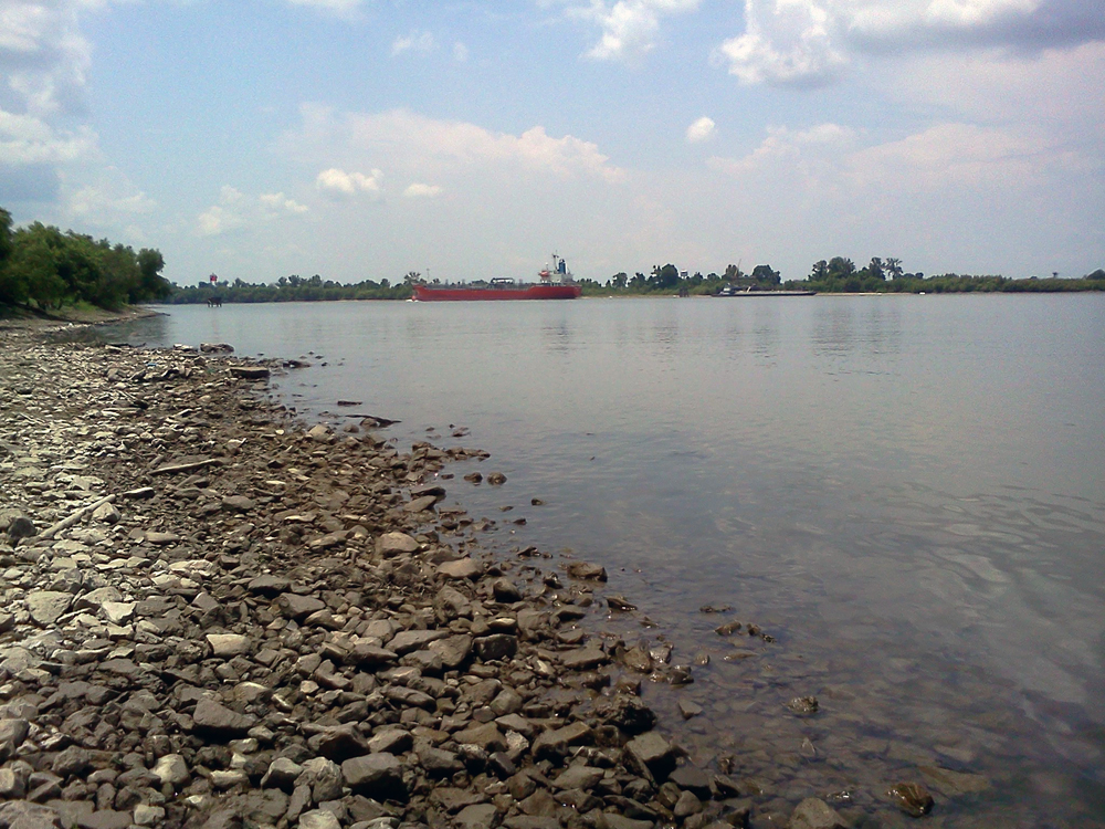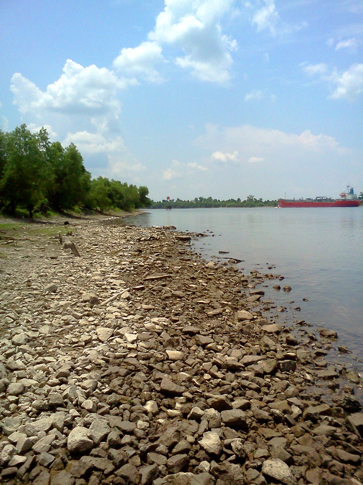 Bearing in mind the warnings from Cootie via email, prior to this venture, of sinking muddy quicksandy holes that can drag you to your doom, I was content to note that, here at least, it was all rocky and solid.  Whew!  And so I stood there for a moment, enjoying my very first moment of actually standing BY the Mississippi instead of looking at it from atop a levee, of being able to reach out and touch the water.