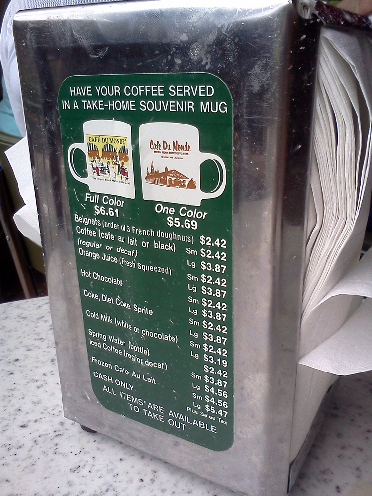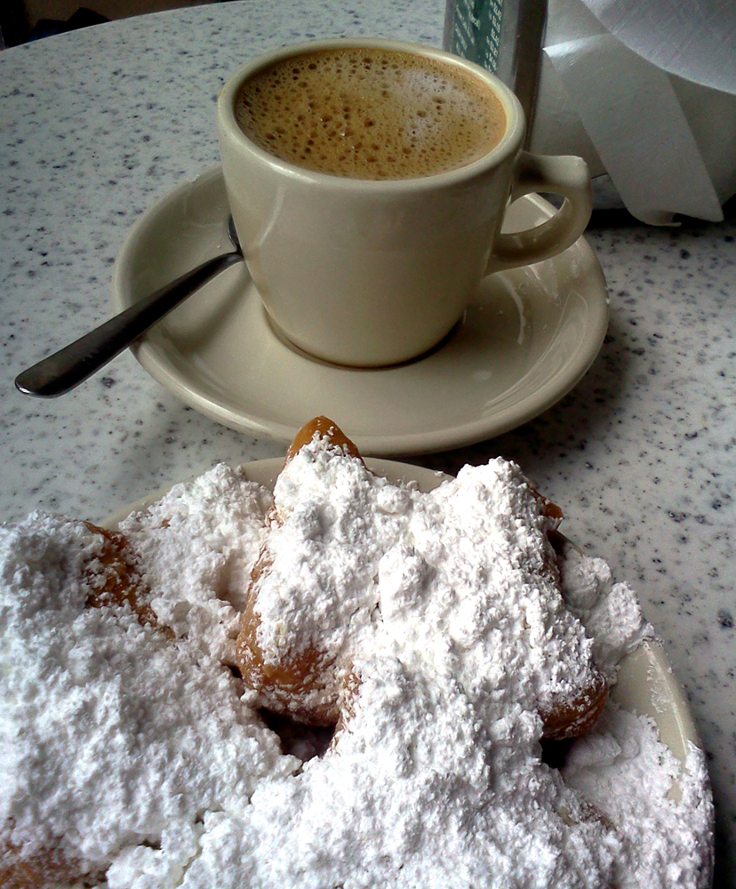 Sigh. Time passed. We were so intensely focused on job-hunting and trying to get some roots dug into the mud, that it didn’t happen right off the bat. And didn’t happen. And didn’t happen. Never mind that, in our FQ strolls, we would walk past Cafe du Monde all. The. Time.