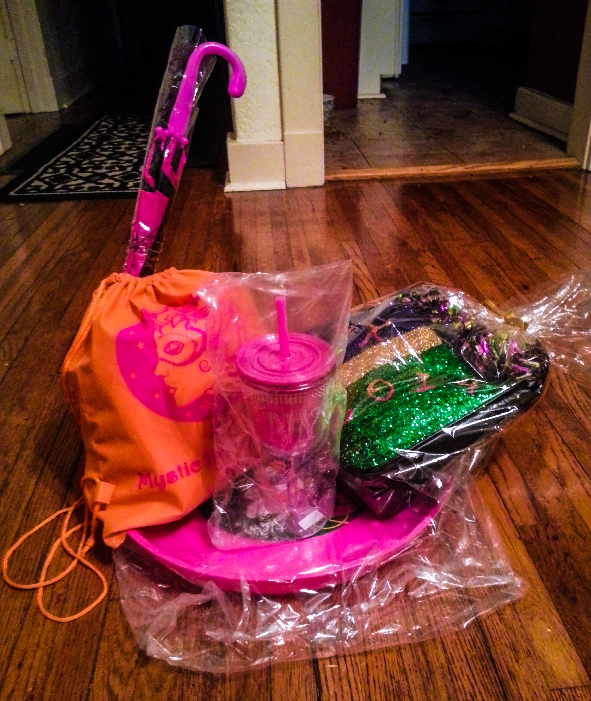 I eagerly counted floats, until Bayoucreole’s came. And then there she was! And what a way to meet! It was SO COOL to finally see her face to face, masks and all even. And then I was stunned and touched and moved when she handed down to me what I now call the Nyx Care Package which has all sorts of goodies and a most incredibly beautiful purse! Truly, I couldn’t believe it. It meant (and still means) so much. A true treasure.