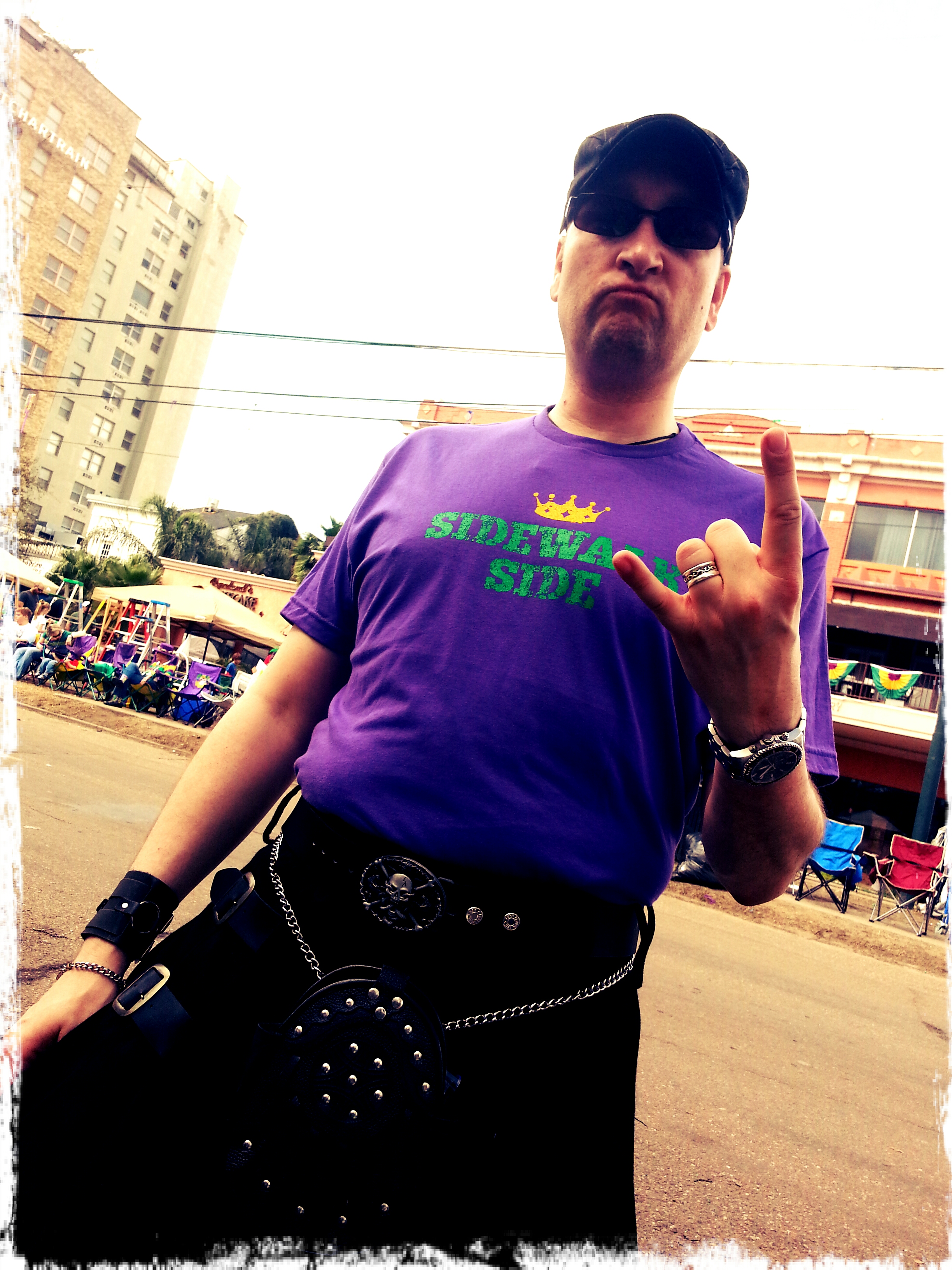 During weekend number 2, J and I were sitting on our sidewalk spot, and it was hot out. Well, it was warm anyway, and after the cold weekend prior, it at least felt hot. J and I were having this discussion about how we finally had figured out which Side we were. As in Sidewalk, vs. Neutral Ground. Definitely sidewalk folks, us. That’s the direction we come from, from the house, and it just feels right over there. SO, hot and enlightened, and in need of a lighter shirt, with plenty of time before the parades that day were going to reach us, J walked down the Avenue to the Fleurty Girl headquarters, and bought us shirts in honor of our at-last discovery. We’d been waiting to find out our Side before getting these!