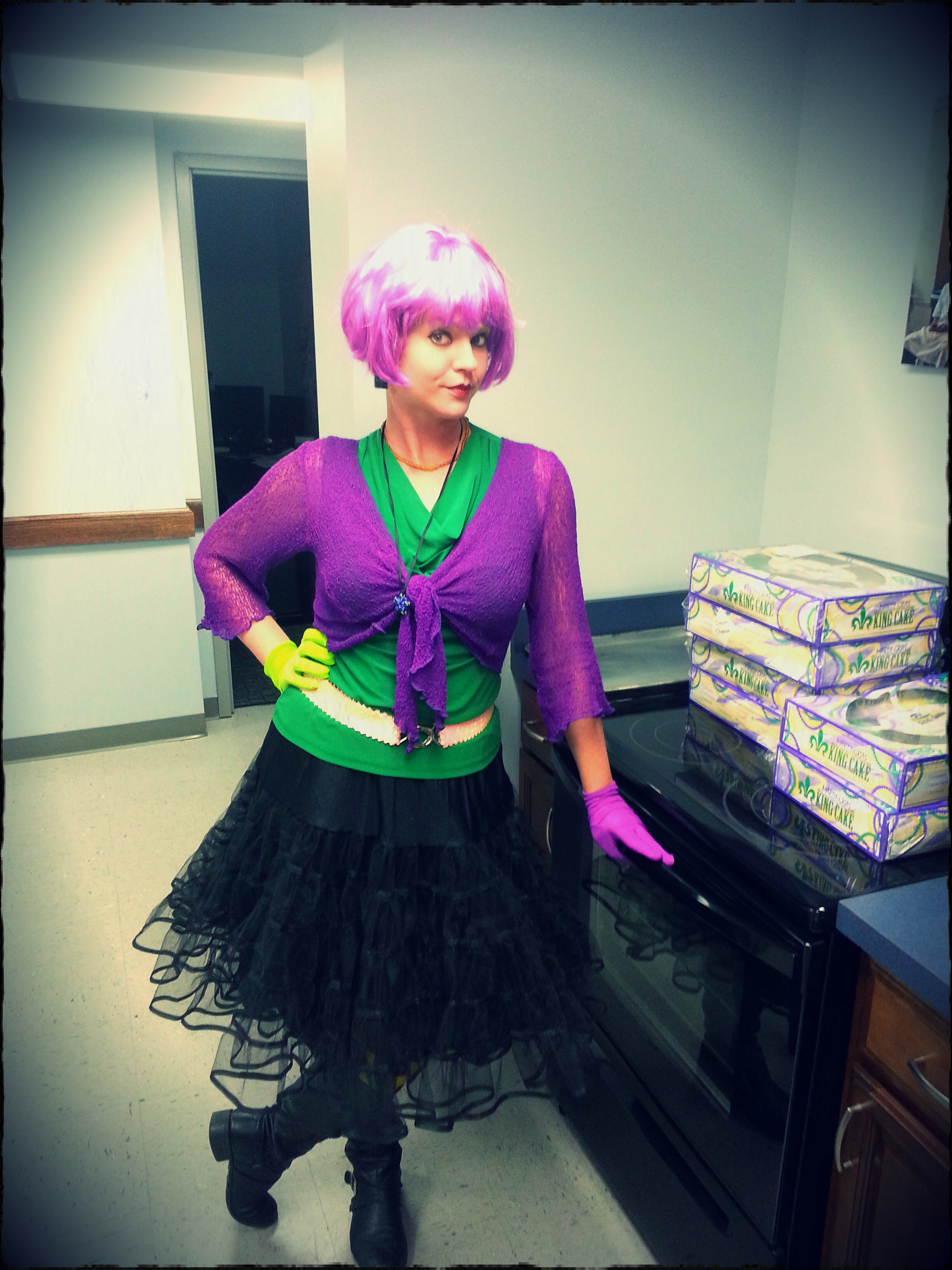 And since you can drag the NOLA girl kicking and screaming out of NOLA and into the suburbs on Mardi Gras, but CANNOT drag that NOLA out of the girl, I put on my very first wig and dressed up and did, as Infamaus called it, the Walking King Cake.