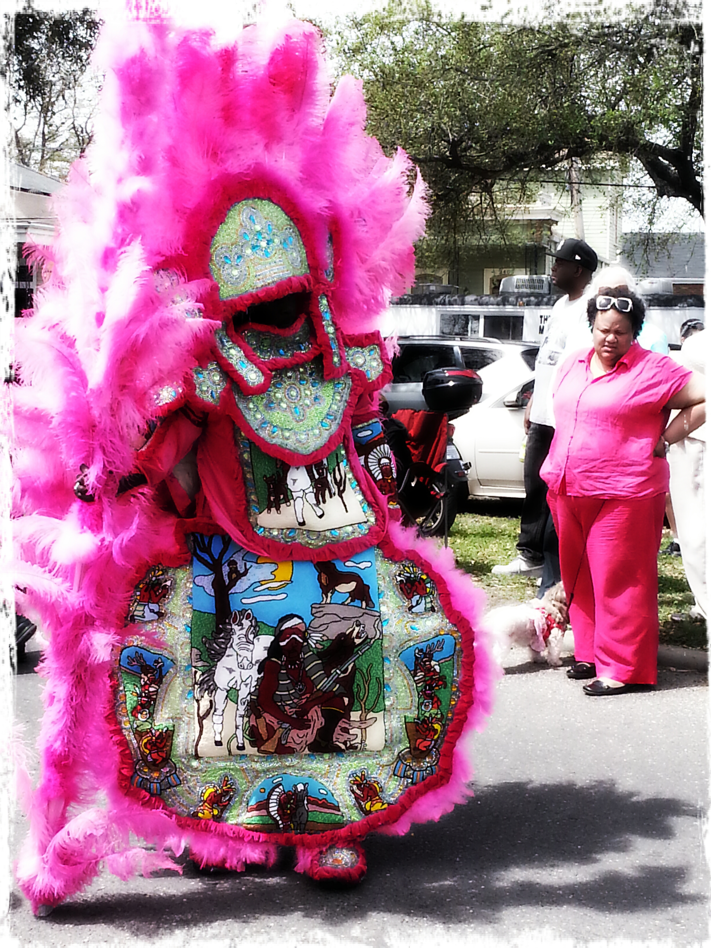 So we had a beverage, and I got my first Sno-Ball of the year, and tried crawfish nachos and a homemade sweet potato pie, and held our first witness to the Mardi Gras Indians in their amazing glory. All while enjoying the weather and rejoicing in the warmth. And getting a sunburn, apparently.