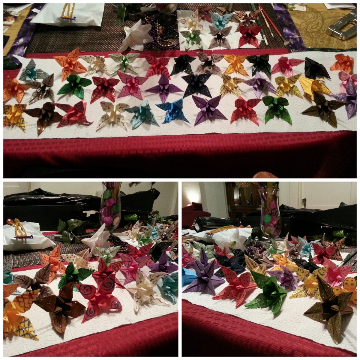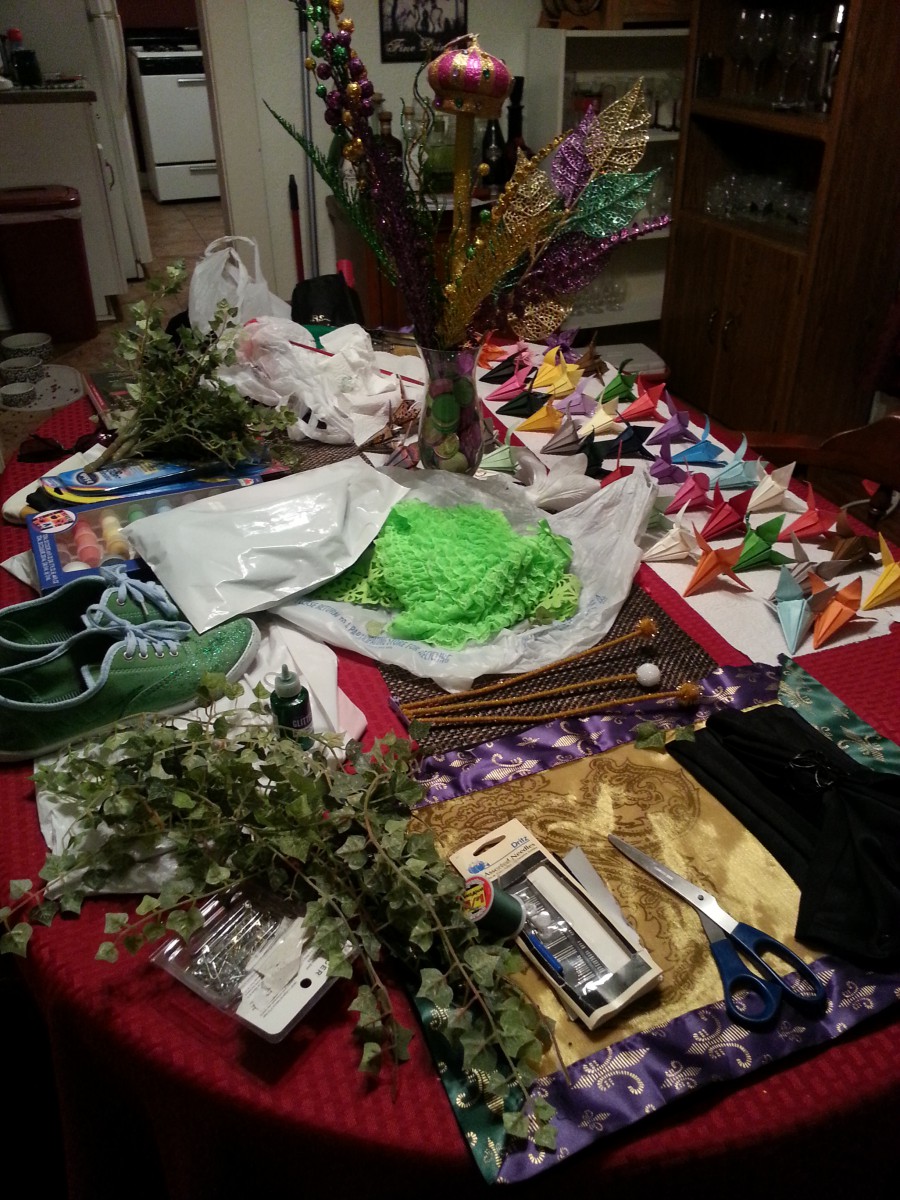 The prep work for this was crazy. Krewe des Fleurs was getting ready for its first march in full force. We made flower costumes. We gathered up our green bits. We made throws. This year, our throws were Lilies, all done by hand in origami. We folded and folded and FOLDED!