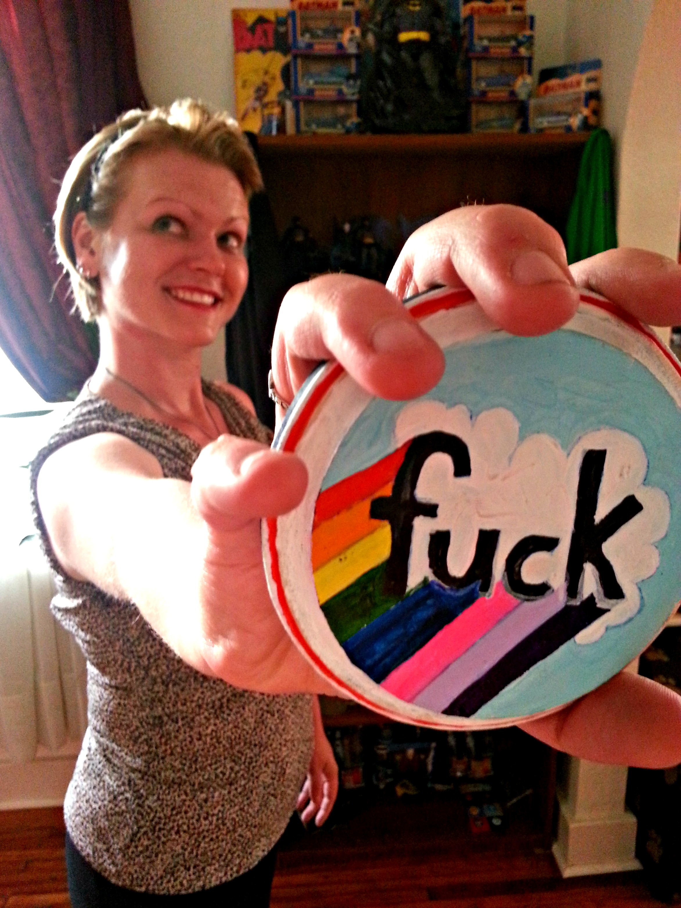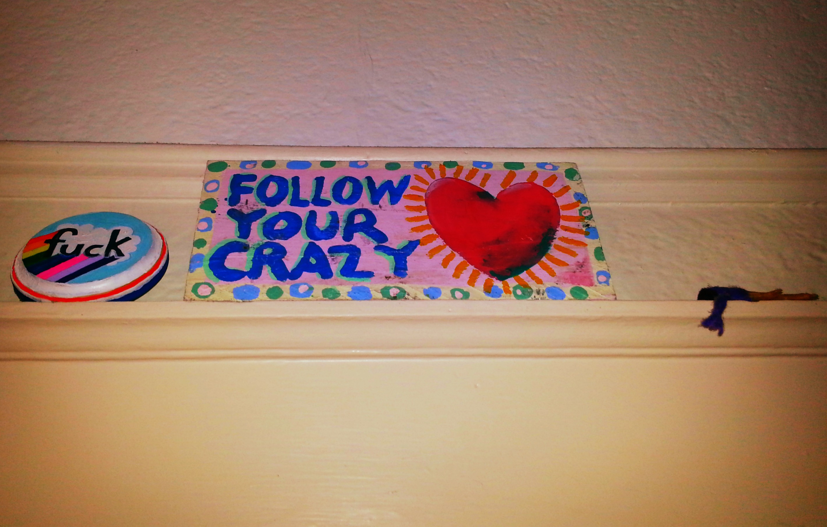 Fluffy Rainbow Fuck (as I affectionately call it) now has a new home in the living room above the front door. Right next to my Follow Your Crazy sign. And a chicken foot.